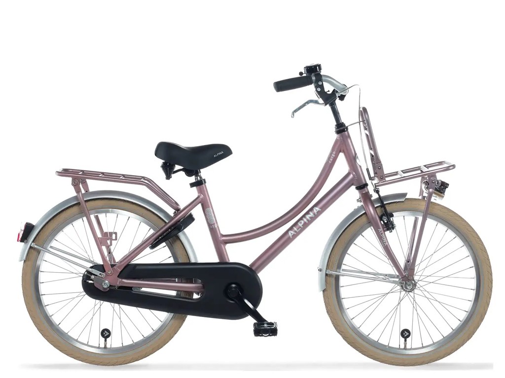 Nieuwe trendy meisjesfiets met voordrager, gesloten kettingkast, batterij LED-verlichting voor en achter en een slot.